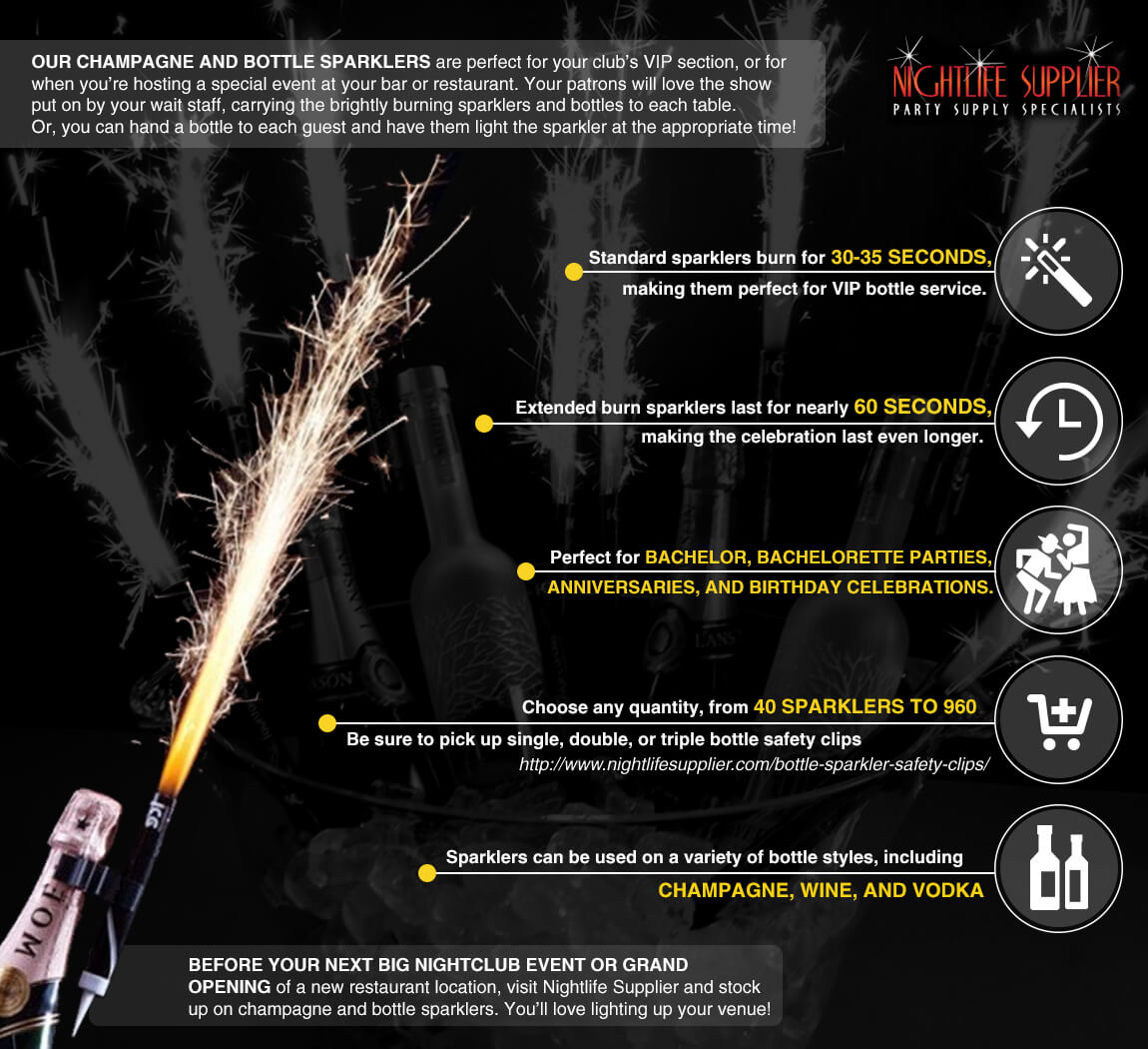 If you're opening a new club, you want to be known as the hottest spot in town as soon as possible. With champagne and bottle sparklers from Nightlife Supplier, people will be flocking to your club in no time. Take a look at the infographic below and see how our sparklers will make your location stand out on the map!